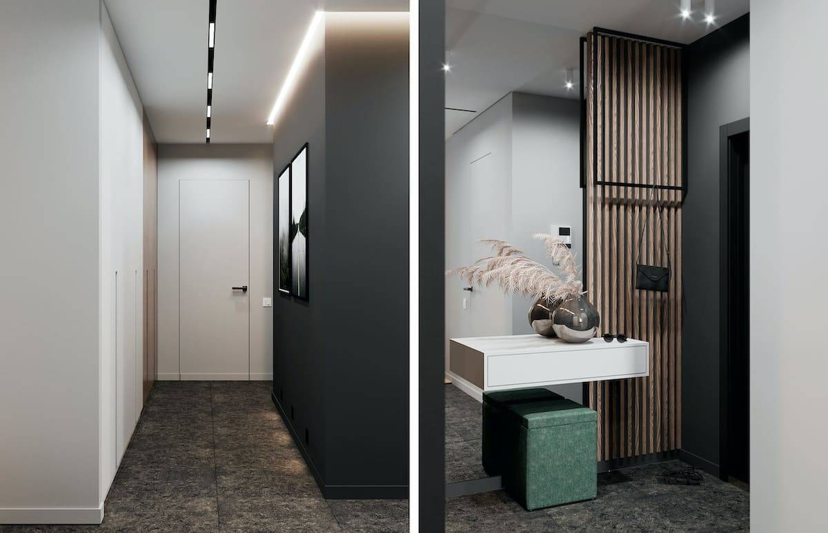 Цвет и текстура покрытий могут сильно различаться. Они выбираются в зависимости от характеристик рассматриваемого коридора. Комбинируя материалы, оттенки и текстуры, можно добиться наилучших результатов. Светлые оттенки оптически расширят пространство, а темные — сузят его. Умелое использование узоров, освещения и установка зеркал могут усилить эффект.