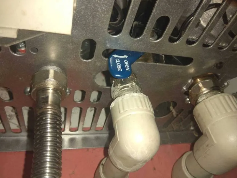 - Открывается кран патрубка, предназначенный для подачи теплоносителя в систему. Данный узел, как правило, располагается внизу агрегата, однако некоторые модели могут иметь другое устройство. Поэтому перед началом заполнения обязательно проводится сверка по технической документации.