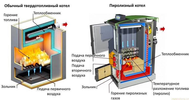 Схематичное устройство обычного твердотопливного и пиролизного котлов