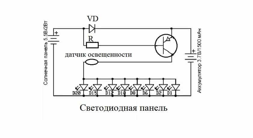 В светлое время суток датчик освещенности под воздействием естественного освещения выступает в роли токоограничивающего резистора, запирающего цепь питания светодиодной панели. С наступлением темноты фотоэлемент перестает генерировать электроэнергию, но за счет диода VD накопленная в емкости аккумулятора электроэнергия не растрачивается на обратный разряд.