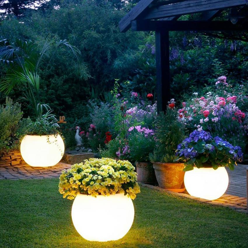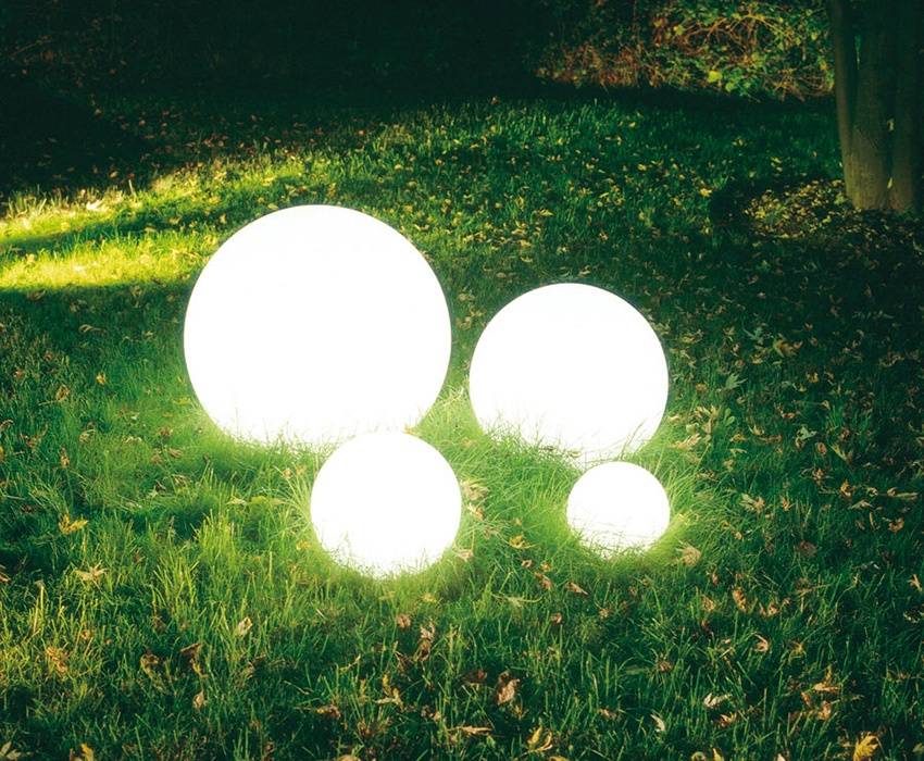 - светильники для сада и придомовых территории, которые в основном служат для декоративного оформления и освещают своим светом небольшой участок площади вокруг себя;
