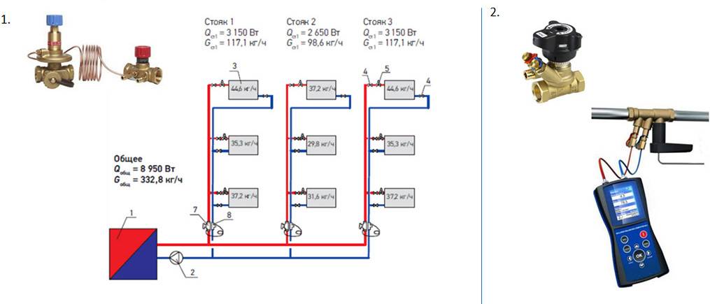 со встроенными штуцерами, нужны для включения электроники. С помощью расходомера определяем актуальный расход на каждом контуре, предварительно вмонтировав на подводке необходумую арматуру. Анализирующий прибор соединяется с клапаном и регулируется согласно схеме.