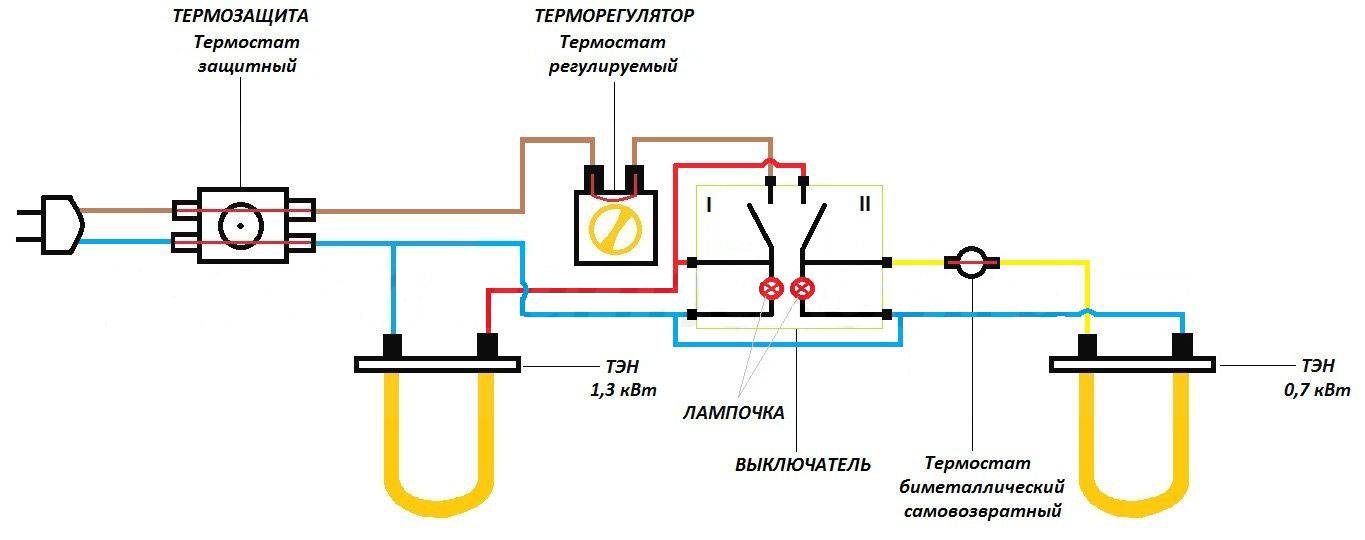 Схема, подходящая для большинства выпускаемых аппаратов для нагрева воды, представлена на картинке ниже: