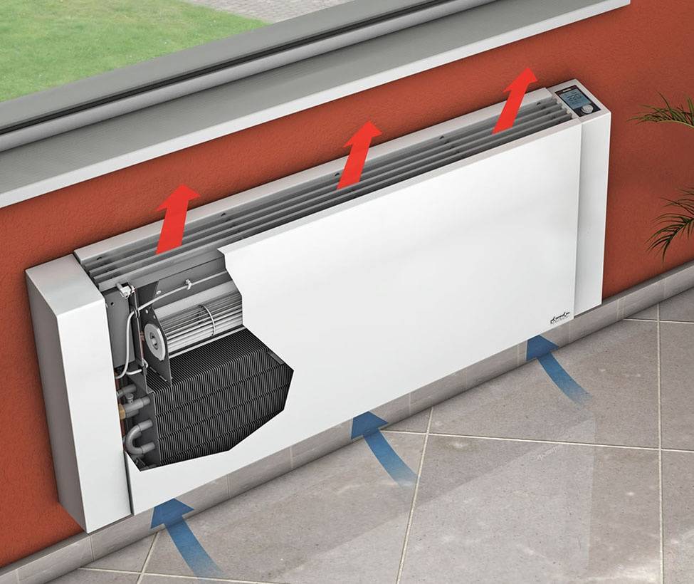 В конвекторах производится нагрев холодного воздуха за счет работы специальных нагревательных элементов, изготовленных из токопроводящих компонентов. Нагретый воздух увеличивается в размерах и поднимается через жалюзи выходной решетки вверх.