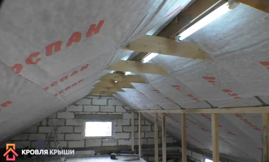 Узкую заводскую пленку надо фиксировать не горизонтальными, а вертикальными полосами. Стыки располагайте на стропилинах, в этих местах проще приклеивать скотч, есть упор. Не путайте ветрозащитные материалы с парозащитными. Первые пар пропускают, их надо монтировать между минеральной ватой и кровлей. Вторые полностью не пропускают пар, они должны устанавливаться с внутренней стороны мансардного помещения.