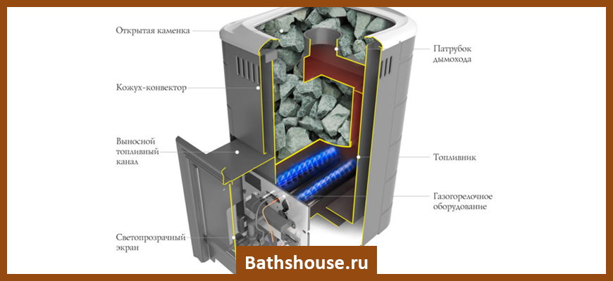 С помощью газового оборудования возможно получить качественное тепло, причем оно будет возникает быстро, а нагрев настолько экономичный, что вам не придется тратить слишком много средств. Также газовая каменка является той разновидностью, от использования которой вряд ли удастся отравиться угарным газом.