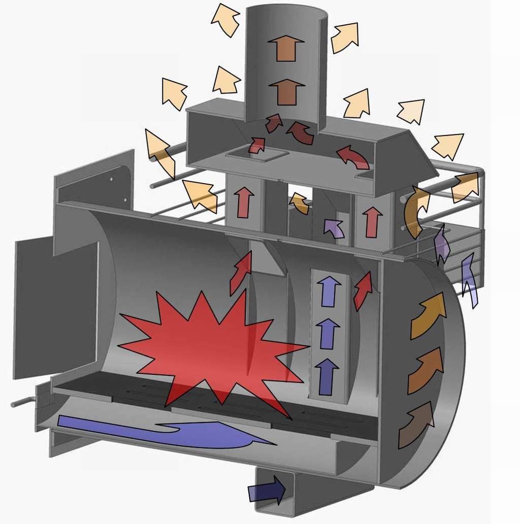 В чугунной печи нагревание воды в теплообменнике производится отходящими дымовыми газами и тепловым излучением. Корпус теплообменника при этом располагается в верхней части топки в районе дымовой трубы.