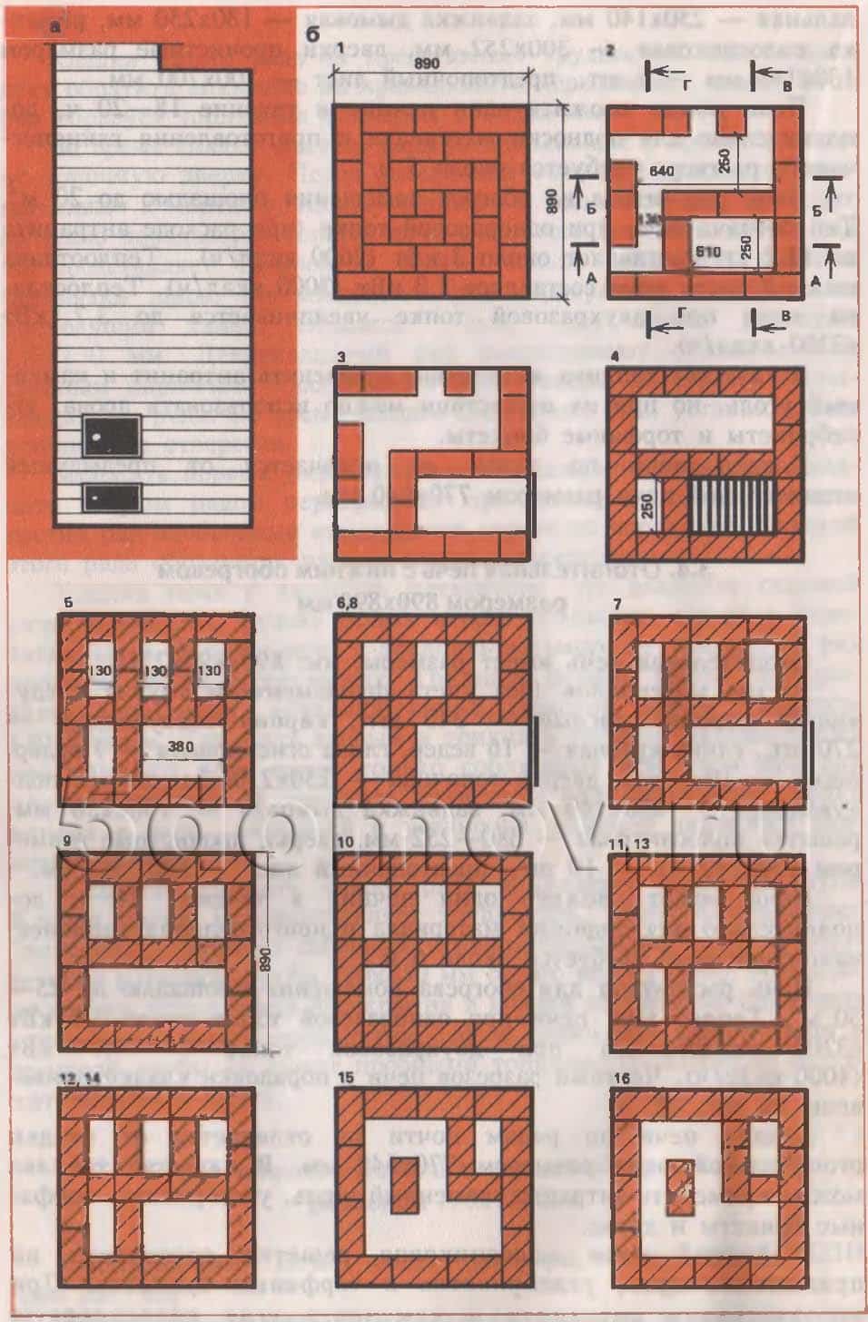 Рис. 3. Отопительная печь с нижним обогревом размером 890×890 мм а — фасад; б — кладка 1 —16 рядов;