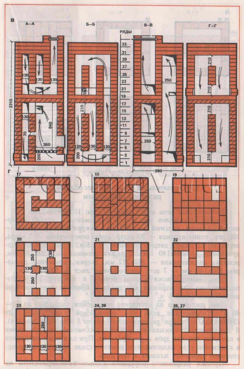 Самостоятельная работа потребует схемы кладки кирпичей в каждом ряду. Такие чертежи называют порядовками. Дым внутри очага проходит сложный путь — нагревая поверхности, он стремится к выходу. Если каналы сложить неправильно, исчезнет тяга и газы, выделяемые при горении, будут поступать в комнату.