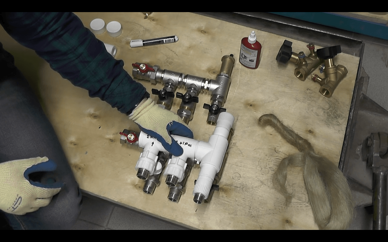 - Происходит установка пропускного клапана. Он должен оснащаться ограничителем температуры. За этим узлом происходит установка распределительной гребенки.