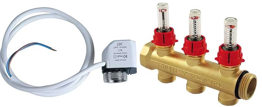 - С расходомерами — они расположены на подающей трубе коллектора, а на обратной размещены гнёзда для сервоприводов. Такой прибор предназначен для тёплых полов имеющих различную длину контуров, наличие расходомеров позволяет регулировать объём теплоносителя в каждом контуре.