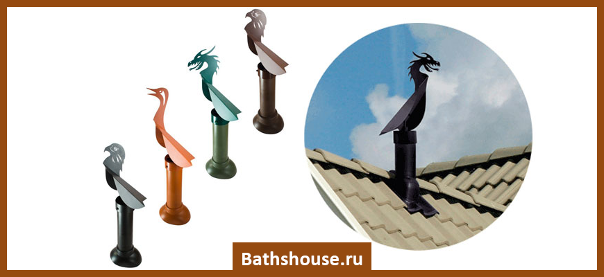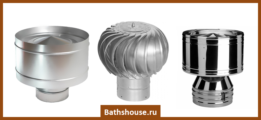 Есть еще и дефлекторы, которые ускоряют вывод продуктов сгорания. Их принцип действия основывается на законе аэродинамики. Когда порывы ветра сталкиваются с дефлектором, возникает эффект разрежения воздуха. Это способствует усилению тяги и выводу дыма.