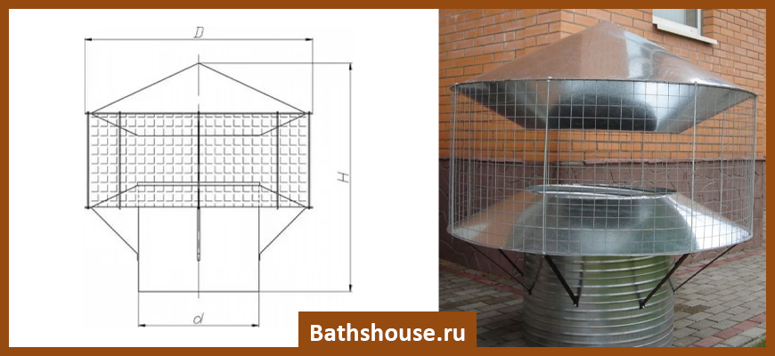 - дымник с сеткой. Отличается от стандартного варианта наличием металлизированной сетки, которая защищает от гнездования птиц, мусора и прочих внешних засоров.