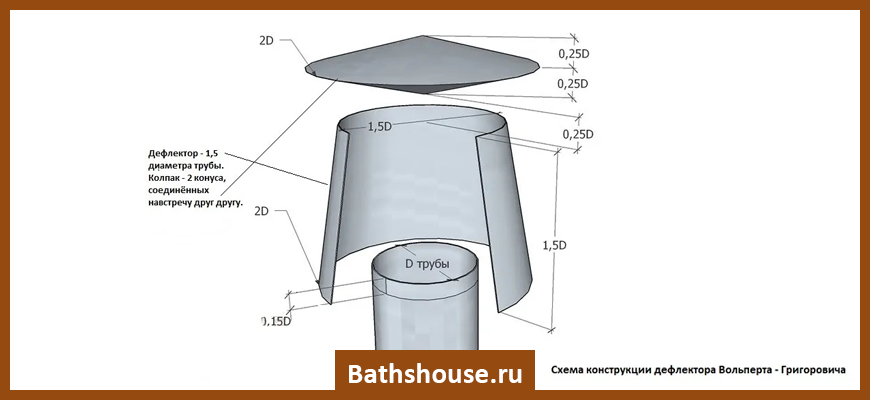 Чтобы изготовить грибок проведите расчет его размеров, и подготовьте чертежи. Для выполнения этой задачи нужно точно знать диаметр дымовой трубы. Его обозначают латинской буквой D. Все прочие параметры высчитываются относительно размеров газоходного канала.Выглядят они следующим образом: