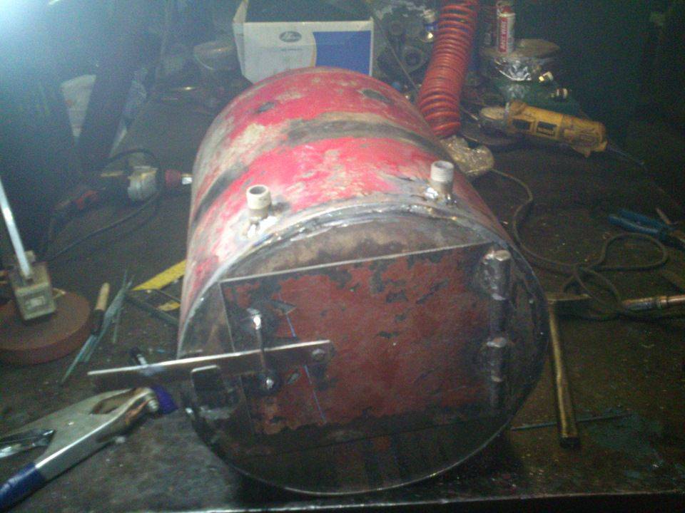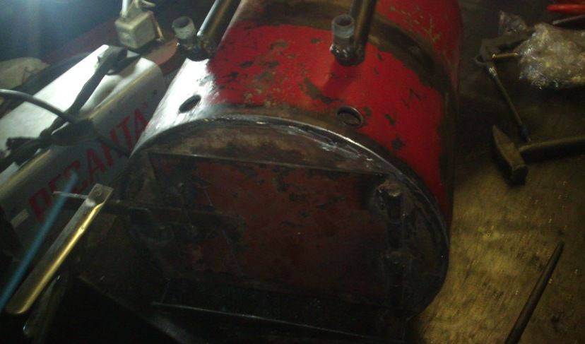 - Вверху баллона сбоку выпилить отверстие для трубы 100–150 мм в диаметре (дымоотвод). Приварить к нему отрезок трубы длиной до 400 мм.