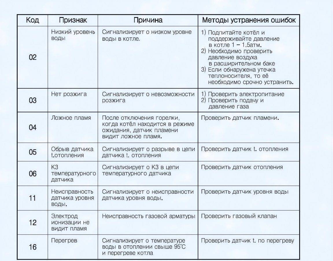 Мы остановились на самых частых сбоях в работе котлов навьен, но на самом деле кодов ошибок существенно больше. Способы проверки и устранения неполадок – это тема отдельной статьи. Для удобства приведем сводную таблицу кодов с кратким описанием: