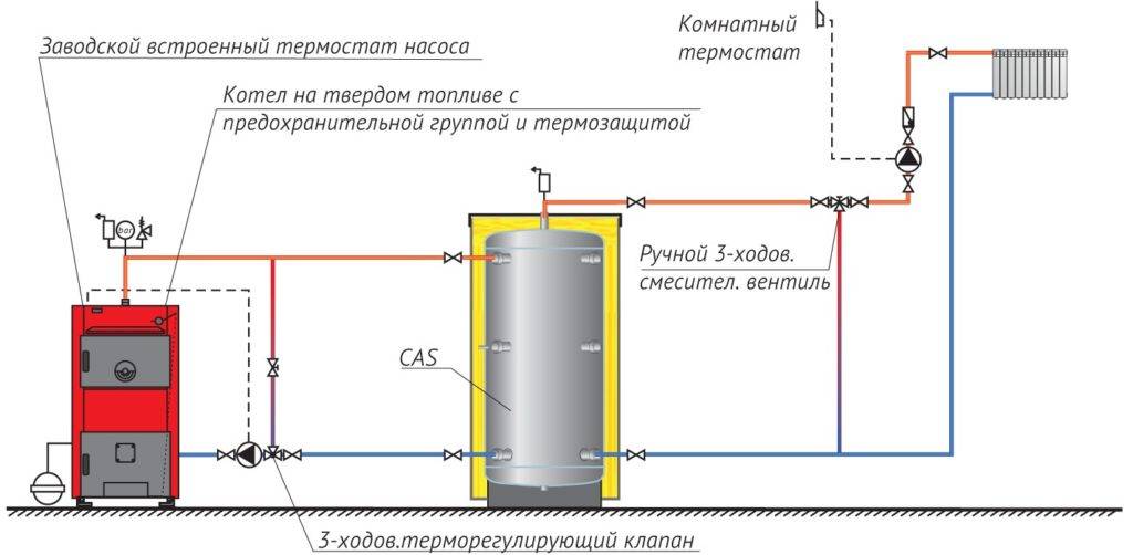 - Тепловой аккумулятор. Имея большой объем, является очень полезным, ведь позволяет накапливать избыточное тепло и затем отдавать его внутрь частного дома с подвалом и двумя этажами. Чтобы он отдал столько тепла, сколько нужно, применяют термостат, подключенный к циркуляционному насосу.