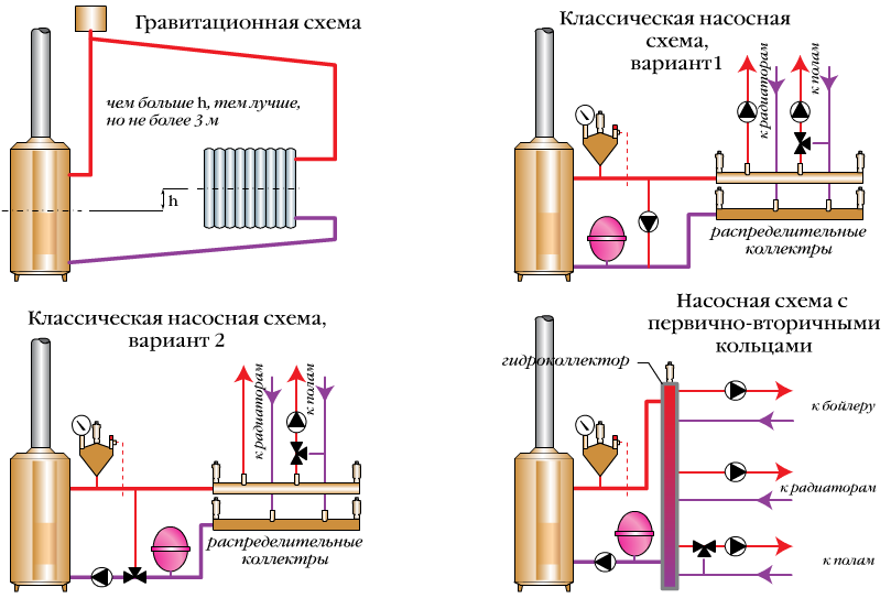 - Правильного расчета способа циркуляции теплоносителя. Будет ли она естественной ( за счет правильной манипуляции диаметрами труб, их наклоном, высоты бака и прочего) или принудительной (с использованием в схеме насоса).