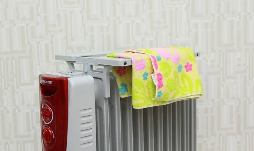 Если вы обратите внимание на съемную вешалку-полотенцесушитель, которой комплектуются некоторые модели масляных радиаторов, то размещаемые на ней вещи будут сушиться не вплотную к прибору — не некотором удалении. Кстати, процесс сушки вещей на полотенцесушителе (и только на нем!) должен строго отслеживаться домочадцами — после того, как вещи высохнут, их нужно удалить с вешалки