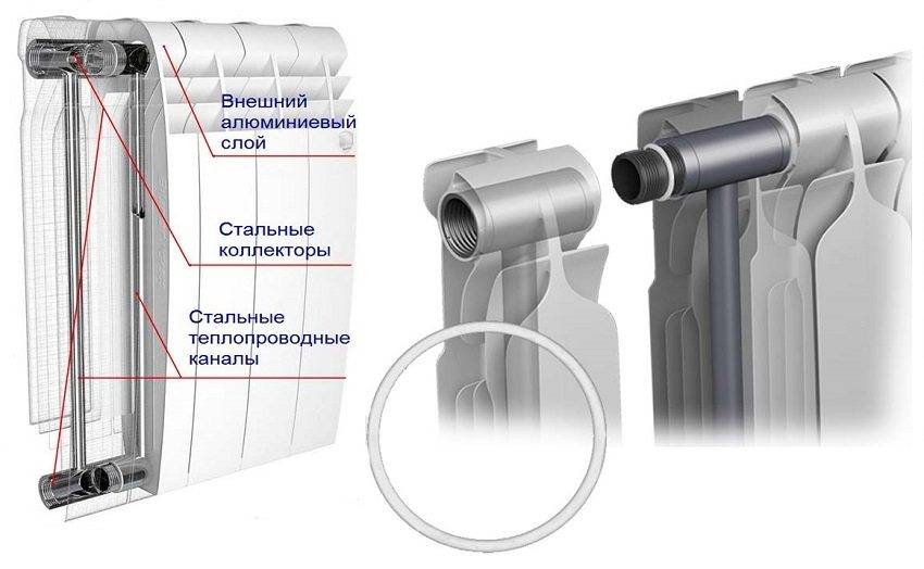 Конструкция биметаллических батарей состоит из набора секций. В собранном виде такой пакет представляет собой две горизонтальные трубы, соединенные вертикальными полыми ребрами, по которым циркулирует теплоноситель.
