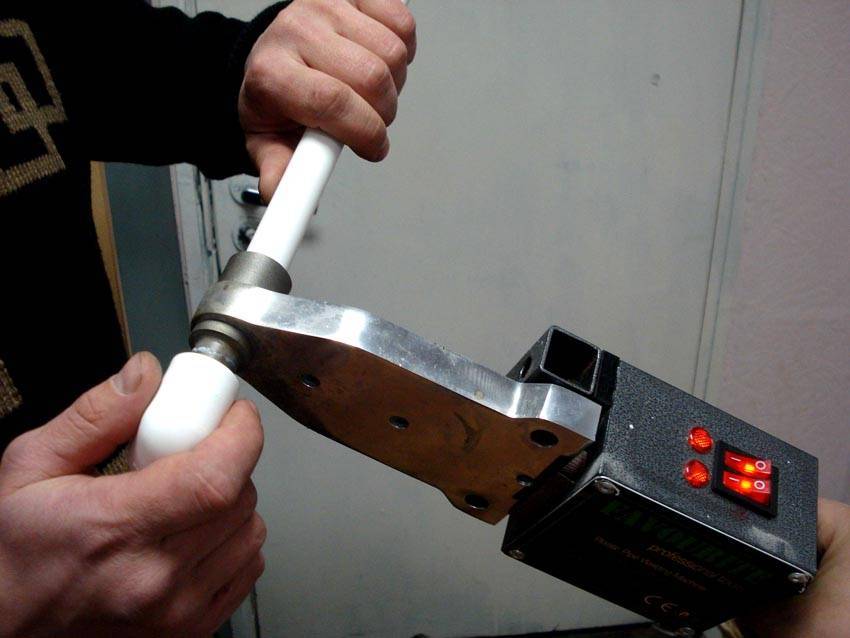 Фото 2. Специальный паяльник для соединения труб из полипропилена. В приборе есть два отверстия разного диаметра.