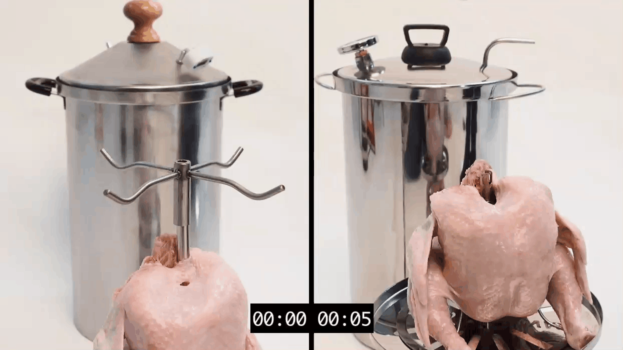 - Правильная насадка полностью “раскрывает” тушку. Дым свободно проникает внутрь, и курица коптится равномерно со всех сторон. Вывод: насадка для курицы должна быть в комплекте. Представьте, как курочка будет “сидеть” на насадке — дым должен быть и снаружи, и внутри тушки.