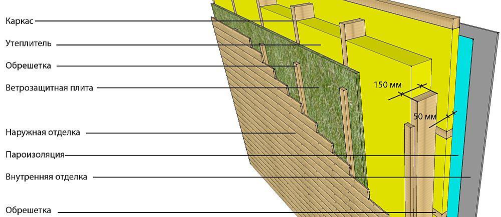 Под декоративной отделкой стен и потолка должен находиться вентиляционный интервал в два сантиметра. Минеральная вата прикрепляется промеж опор.