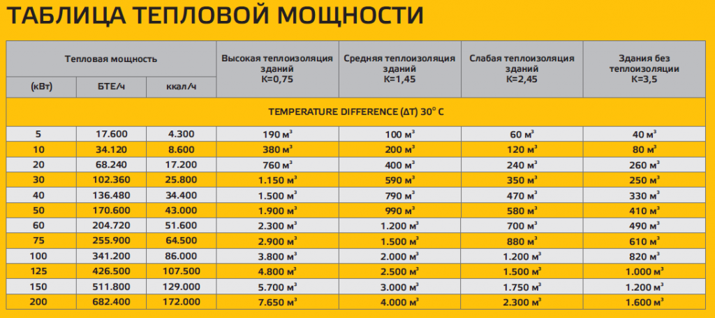 Грамотный выбор нагревательного оборудования возможен лишь после ознакомления с порядком расчета тепловой мощности, требуемой в каждом конкретном случае. Формула, используемая для его точного определения, выглядит так: P=V∆TK= ккал/час: