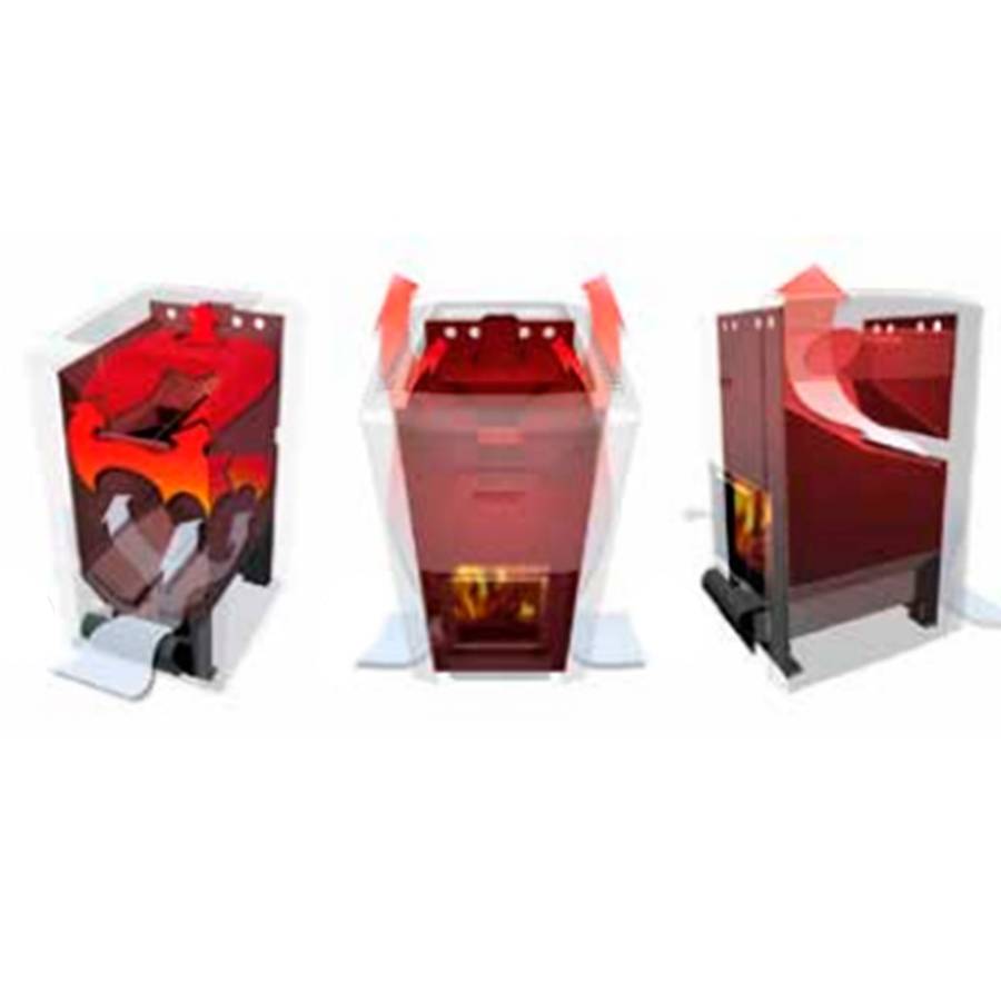 - Каналы конвекции расположены таким образом, чтобы тепло от топки сохранялось максимально долгое время. Прохладный воздух через специальные отводы внизу конструкции попадает внутрь корпуса. Температура воздуха повышается очень быстро. И обогрев осуществляется уже через пять минут после начала растопки.