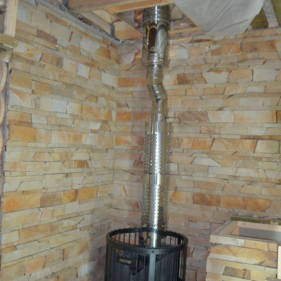 - Дымоход пролегает сквозь каменку. При такой конструкции дополнительно прогреваются камни.