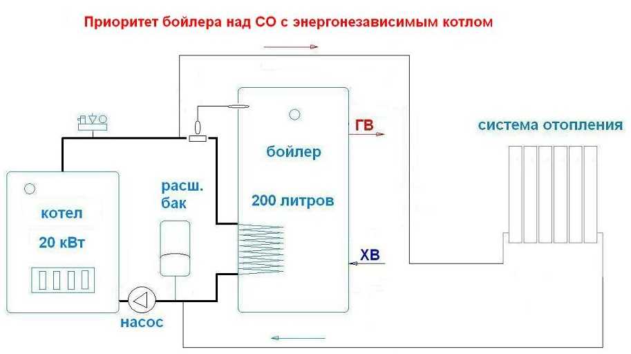 Приоритет обеспечивается большим контуром, который подводится к водонагревателю. Он должен быть на шаг больше, чем тот, который подводится к отопительной системе.