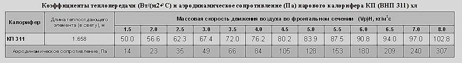 Коэффициенты теплопередачи и аэродинамическое сопротивление калорифера КП 311 (ВНП 113-311) парового