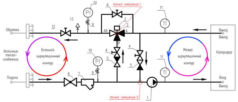 Регулирующий арматурный каркас (обвязка калорифера приточной вентиляции) в зависимости от используемого источника поступления нагретой воды зачастую осуществляется двумя способами: