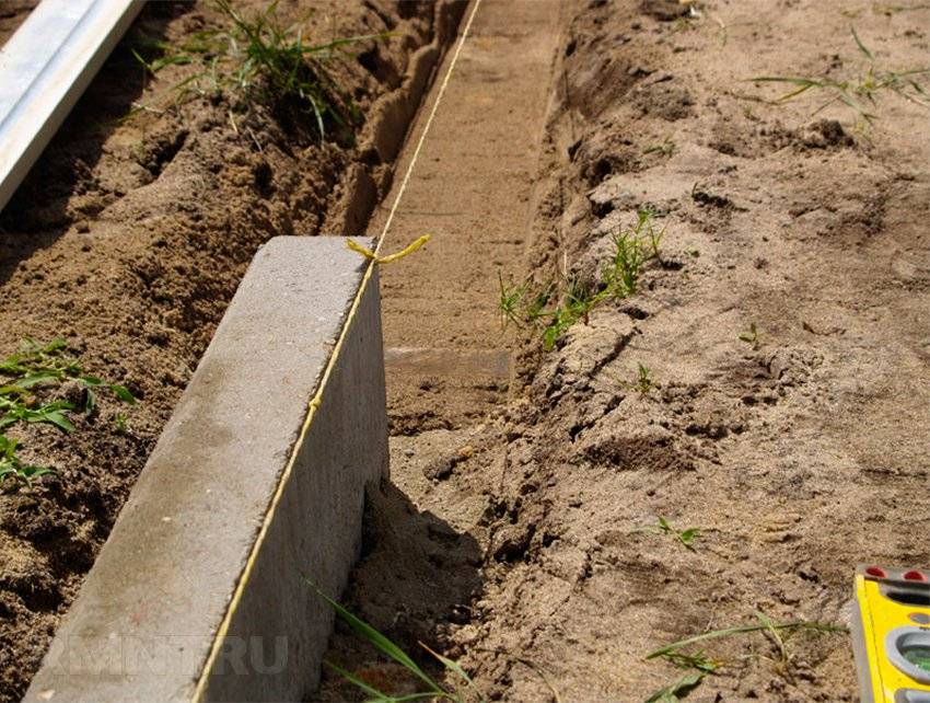 Перед началом работ, нужно определить ширину бордюра при помощи нитей и колышков. Стандартный размер 400-600 мм.
