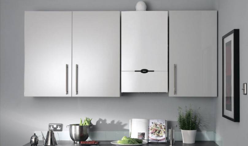 Современная компактная модель газового настенного котла в интерьере кухни