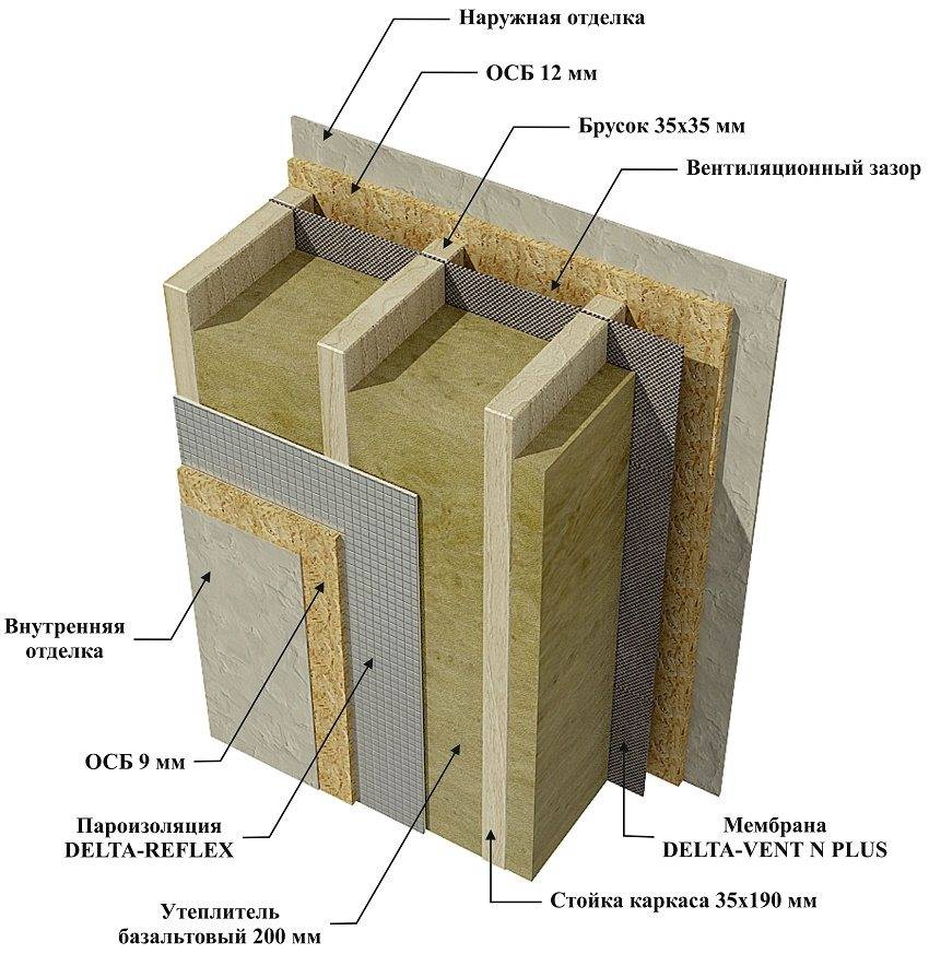 Такой стеновой пирог является идеальным решением для каркасного дома.