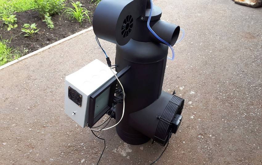 Важный момент. Обдувать корпус чудо-печки не рекомендуется по понятным причинам. Водяной контур, установленный на дымоход, нужно подключать к системе отопления с принудительной циркуляцией и расширительным баком открытого типа, чтобы уберечься от закипания. При периодической топке трубопроводы заполняются антифризом.