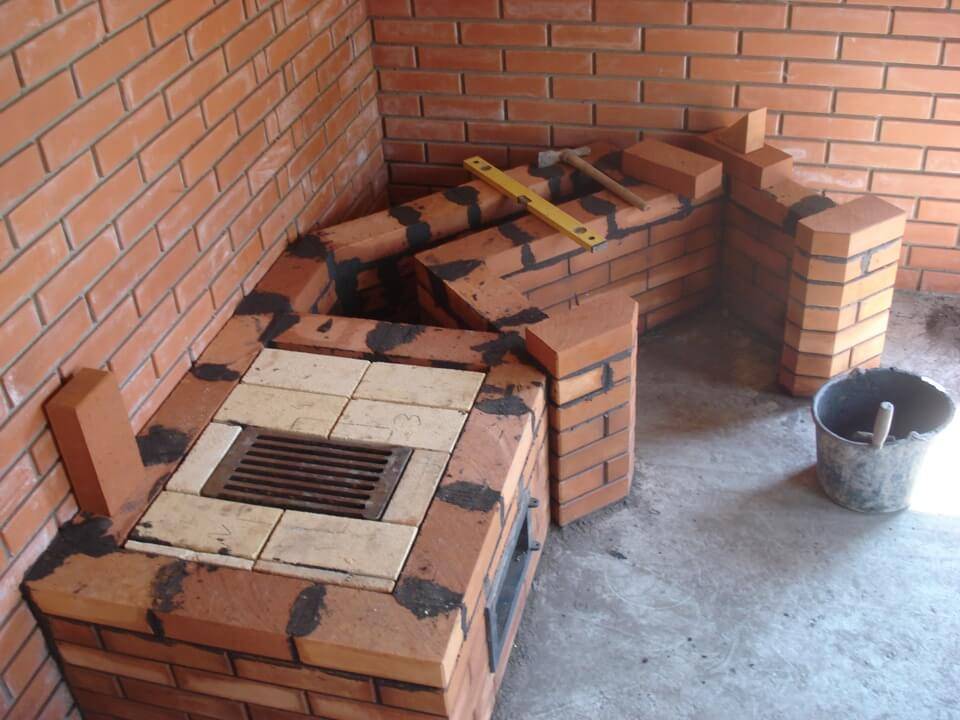 Он может быть выполнен из обычного бетона, цементного раствора или сложен из бетонных блоков. Для кладки печи необходимо закупить 2 вида кирпича: обычный полнотелый из керамики и шамотный (огнеупорный), из которого будет сложена топка, дымовые каналы и все нагреваемые элементы. Стоимость такого материала гораздо выше, чем цена обычного красного кирпича, поэтому обычно из него кладут только те поверхности, которые будут иметь непосредственный контакт с огнем. Все остальные элементы кладут из красного полнотелого кирпича, при этом используют раствор на основе красной печной глины. В состав такого раствора обязательно должен входить жаропрочный цемент. А вот между керамической кладкой и шамотным кирпичом обязательно необходимо выдерживать зазор в 5 мм. Нагреваясь, шамотный кирпич будет расширяться. Поэтому чтобы в процессе эксплуатации конструкция печи не подверглась деформации, необходимо учитывать это зазор. Все покупные элементы для печи (колосниковая решетка, дверца, варочная поверхность, духовой шкаф и т.д.) ставят в соответствии с общей схемой и назначением печи.