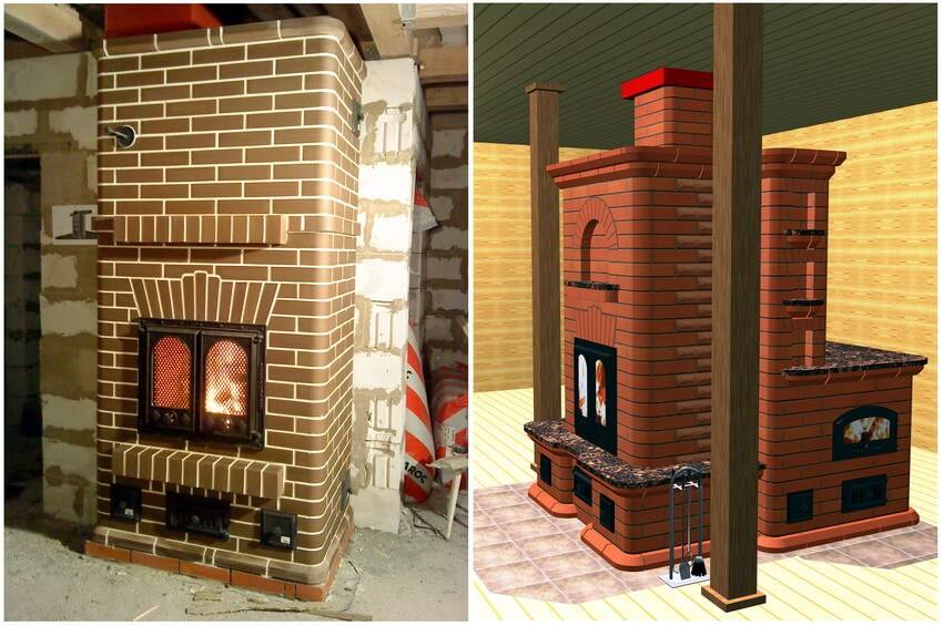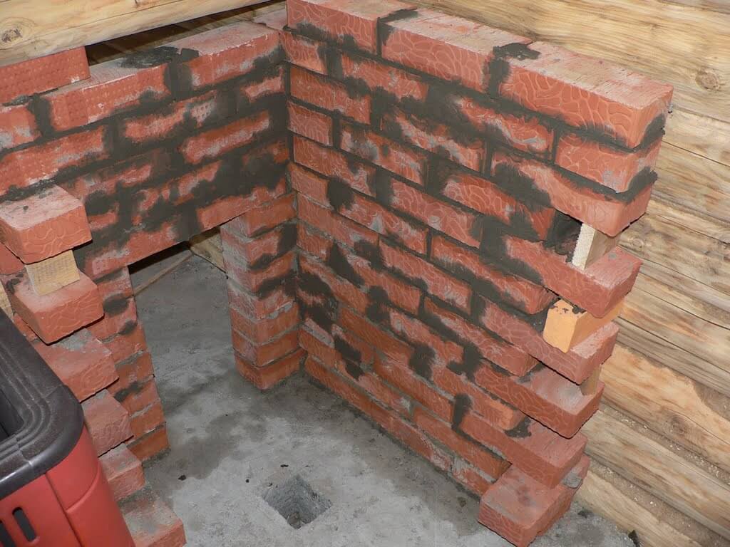 Вставляя дверцу топочной камеры или зольника, необходимо обвязать ее стальной отожжённой проволокой. При этом один конец проволоки вставляется в специально предназначенное отверстие, а второй скручивается в жгут и прокладывается между кирпичами, плотно зажимаясь раствором. При монтаже чугунной топки или чугунной плиты, необходимо обязательно между кирпичом и металлическим элементом прокладывать асбестовый шнур, для компенсации разного температурного расширения материалов. Дымоход для печи можно выполнить из красного керамического кирпича, а можно использовать керамический блочный дымоход, который приобретается в готовом виде. Облицовка является финишным этапом строительства печи из кирпича. Для придания красивого эстетичного вида, печь можно облицевать красным керамическим кирпичом, клинкерным (под дикий камень), декоративной плиткой. Такое покрытие придает неповторимый аутентичный вид печи, а также защищает ее от негативного воздействия окружающей среды.