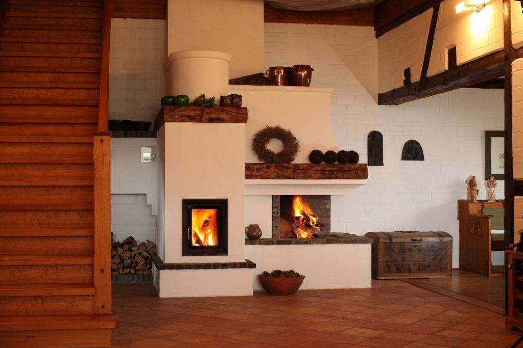 - печь-камин, который может быть расположен таким образом, что отопительно-варочная часть сооружения будет выходить в кухню, а декоративная каминная сторона в спальню или гостиную;