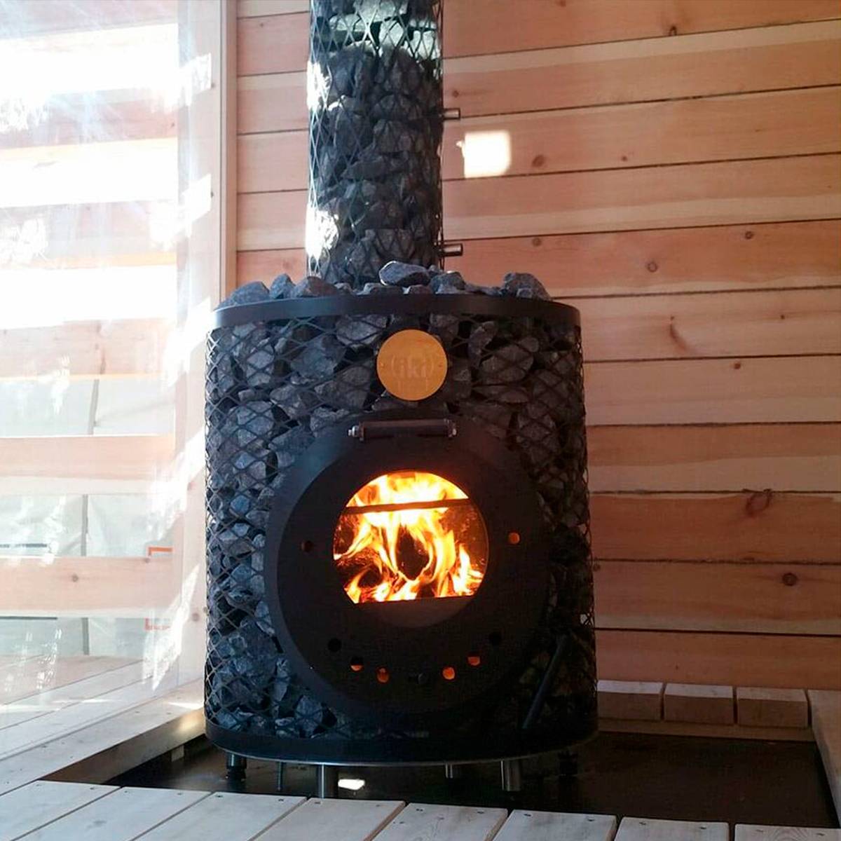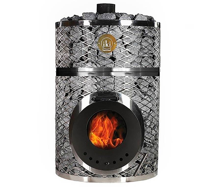 Дровяная печь с системой длительного горения. Выполнена из четырехугольной сетки из нержавеющей стали. Большой стеклянный люк на передней части хорошо освещает пол в парилке. Тяга регулируется поддувом. Скорость нагрева высокая. Температура камней варьируется в разных местах печи.