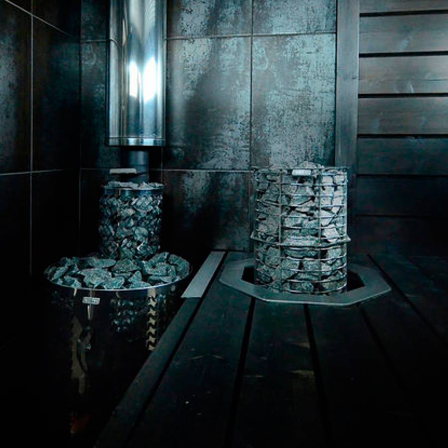 Вмещает до 100 кг камней, в основном имеет открытую конструкцию, что позволяет увеличить количество сухого пара.