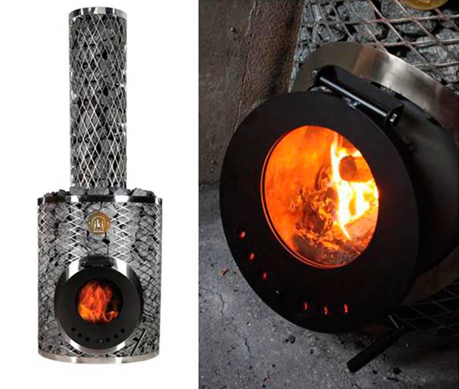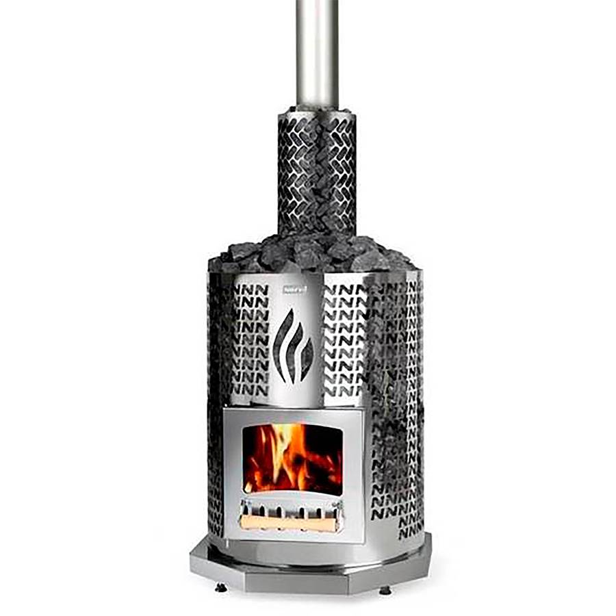 Своеобразная и уникальная по структуре модель. В основе цилиндрическая топка, от которой отходит спиралевидный дымоход, окруженный сеткой-каменкой из нержавеющей стали.