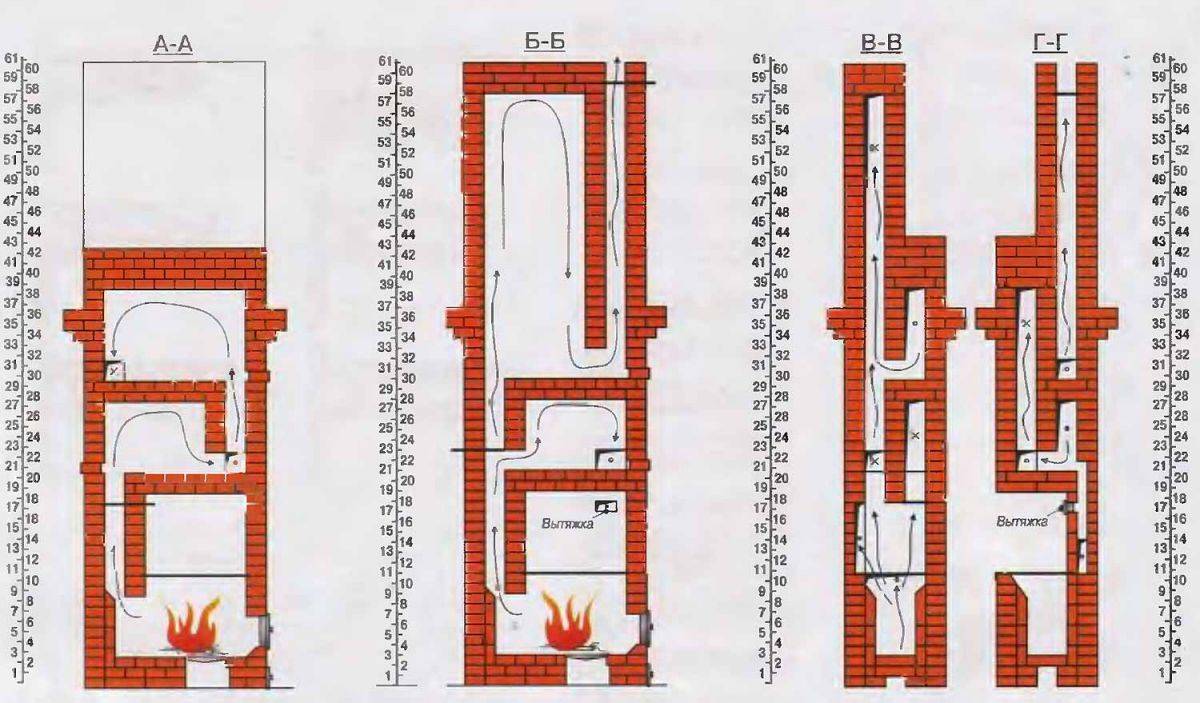 - канал, находящийся между первым и вторым ярусом, следует выкладывать в четверть кирпича, что увеличивает длину топки;