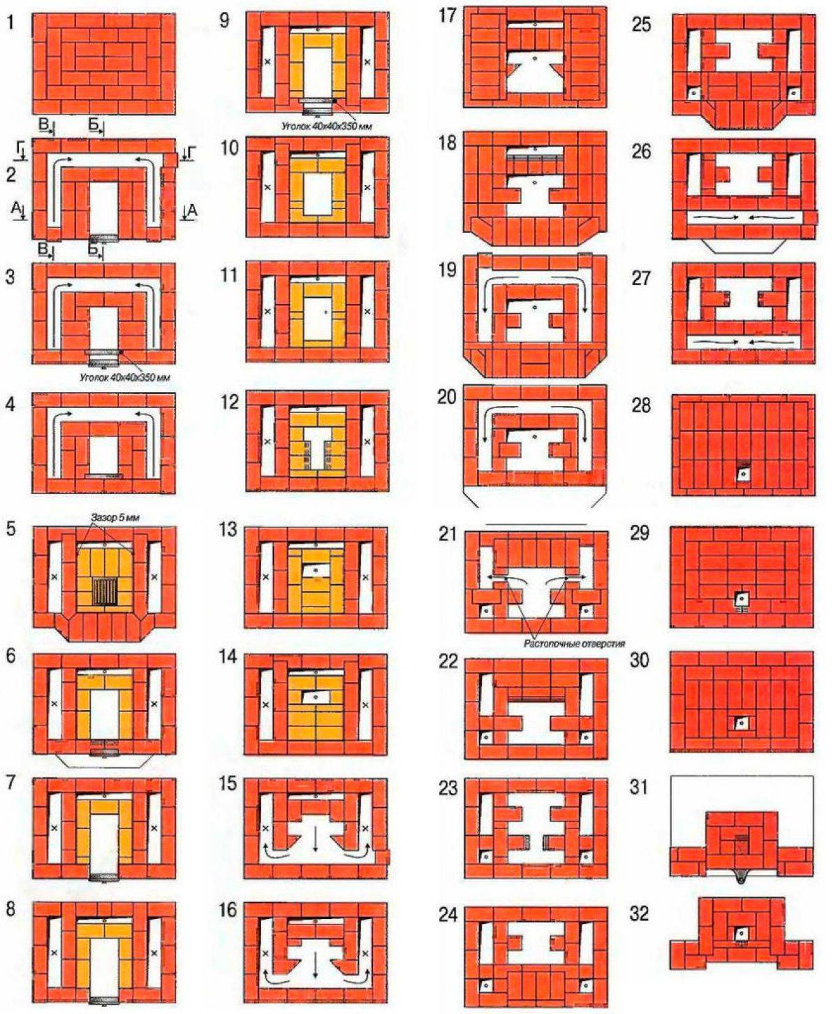 Ну конечно главное что нужно иметь это порядовый план кладки печи. Порядовка банных печей из кирпича Кузнецова выложена в свободный доступ, поэтому, ее можно без проблем скачать и распечатать.