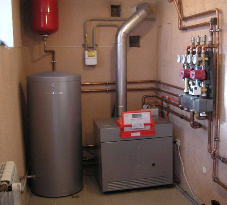 - Входной патрубок теплогенератора должен располагаться ниже батарей первого этажа с учетом уклона обратной магистрали. Возможно, в котельной придется сделать небольшой приямок под установку источника тепла.