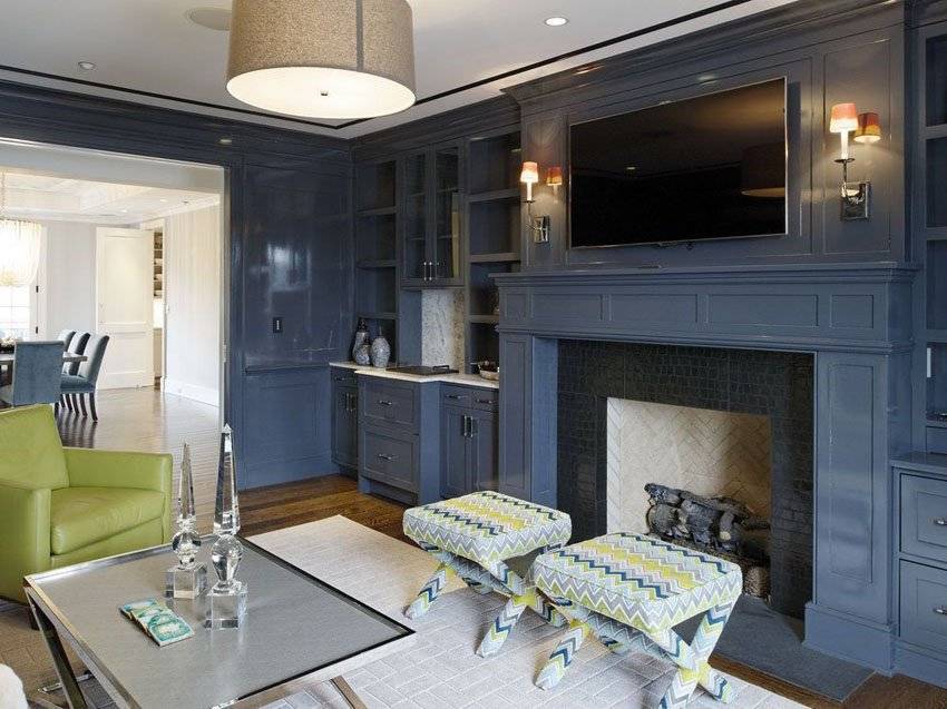 Если требуется добавить ограниченное количество синего цвета в интерьер гостиной, то можно использовать не только шторы, но и такие предметы, как: свечи с синими подсвечниками на стенах, декоративные подушки, фоторамки. Если позволяет площадь помещения, то с помощью камина можно сделать любой интерьер более уютным и оригинальным.