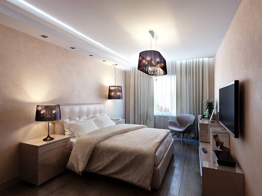 В бежевой спальне отлично будут смотреться элементы, добавляющие интерьеру изысканности. Вышеупомянутый белый воздушный балдахин, постельное белье с розовыми розами, кремовая штора, мягкие подушки на кровати и тканевые абажуры — лишь некоторые из аксессуаров, которые создадут здесь нужное настроение.