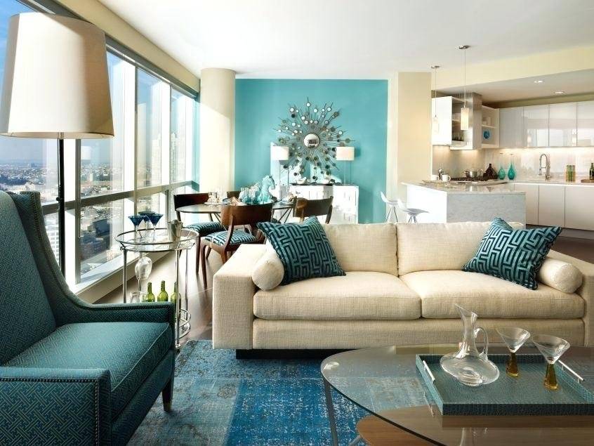 На фоне светло-голубых или бирюзовых стенах оригинально смотрится ярко-синяя мебель. Сбалансировать интерьер можно с помощью ковра, напольных ваз и статуэток выполненных в аналогичном цвете. Изысканное решение — массивные кресла в бирюзовом или аквамариновом цвете.