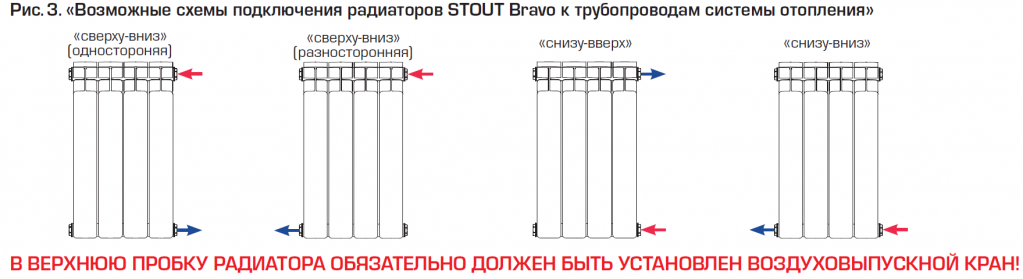 Направления важно не перепутать, т.к. подача в таких отопительных приборах оснащена трубкой, идущей от узла входа вверх. С ее помощью осуществляется доводка теплоносителя до верхнего коллектора. После этого он растекается по радиатору.